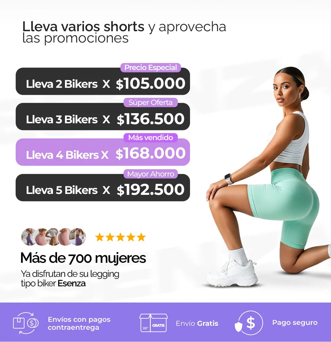 Los Bikers Esenza están diseñados para brindarte seguridad y confianza en cada movimiento. Confeccionados en Suplex de alto gramaje (390g), combinan suavidad y resistencia para ofrecerte un ajuste tipo segunda piel que no transparenta ni se deforma con el uso. Su fajón de doble tela de 12 cm estiliza y contiene el abdomen sin apretar, mientras que el corte anatómico realza naturalmente los glúteos. Versátiles y elegantes, son la prenda ideal para entrenar, salir a la calle o crear looks athleisure modernos.