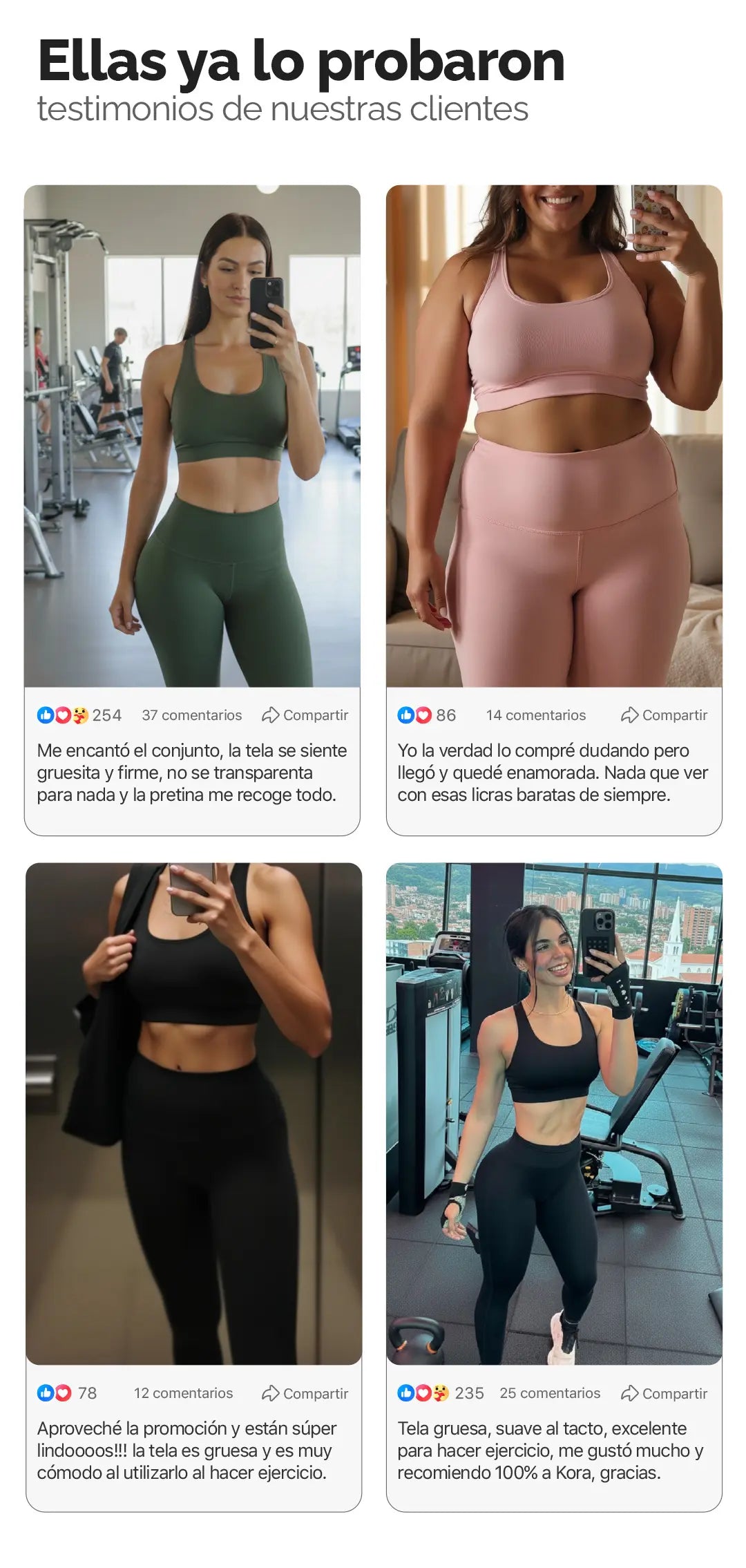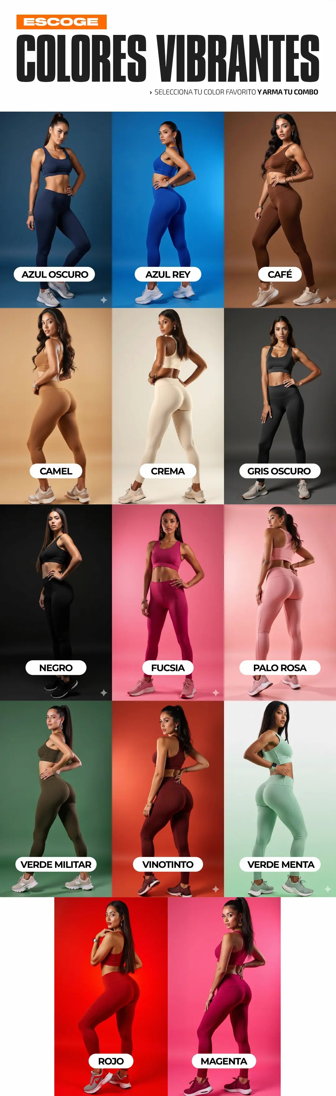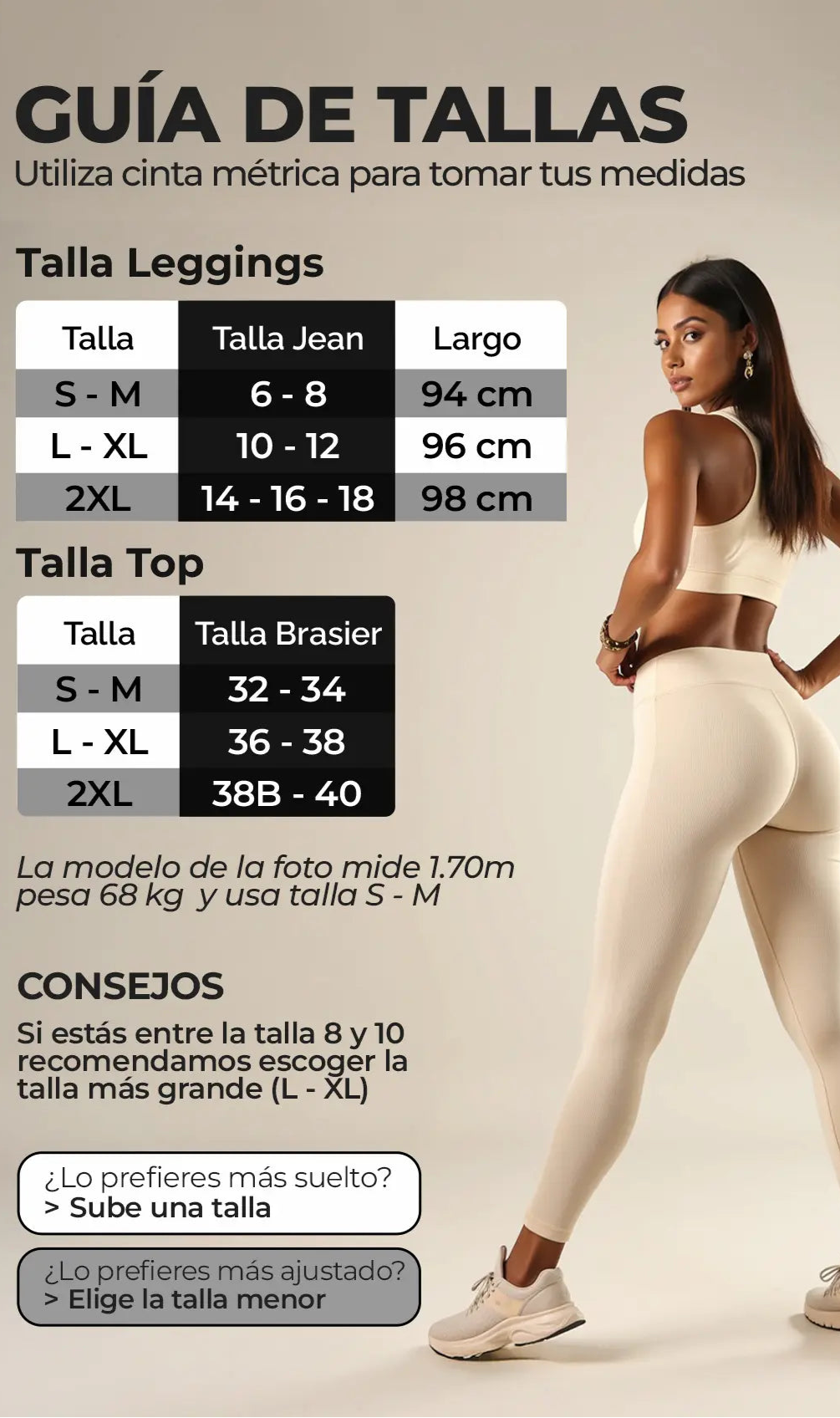 - Composición: Leggings y Top: 80% poliéster, 20% spandex (Suplex de alto gramaje, 390 g/m²).